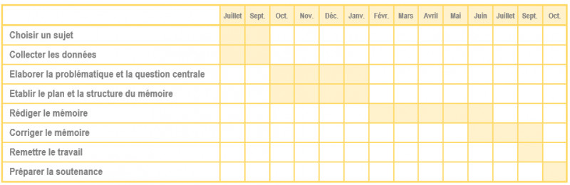 La réalisation du mémoire est avant tout, une commande que l'on se passe à soi-même. Il est le derner obstacle à maitriser pour valider le curus que vous avez choisi. Ci-dessous un exemple des étapes sur une période entre douze et quinze mois : |